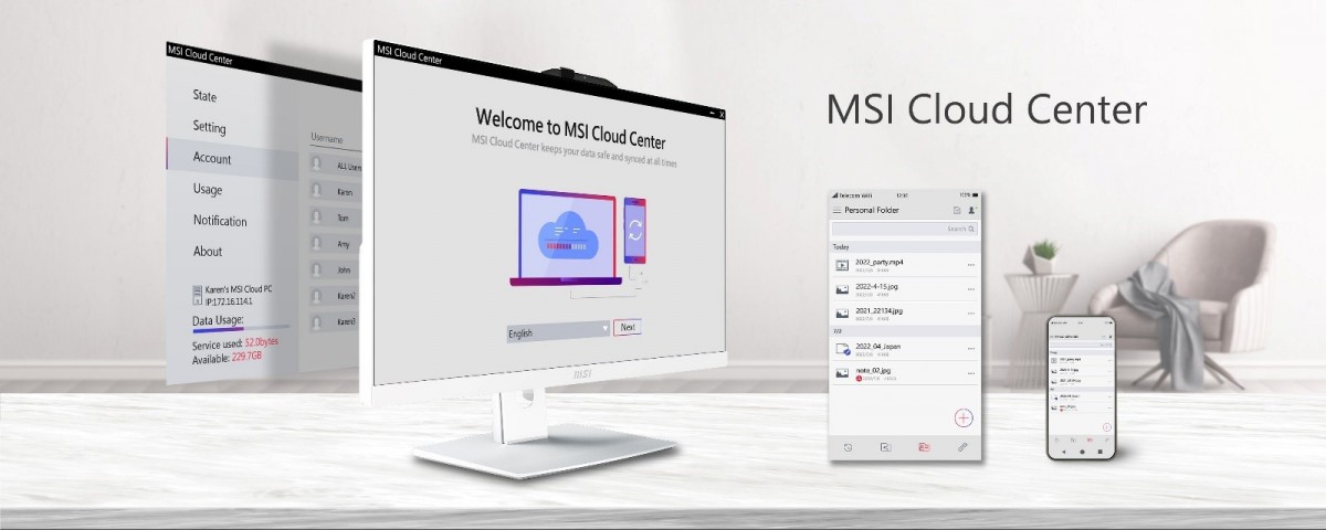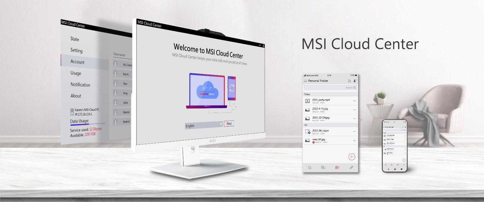 「MSI Cloud Center」讓用戶可以在 Android 或 iOS 設備與 Modern AM242 & AM272 系列一體成型電腦之間備份和下載照片、影像和任何其他文件。只需透過點擊就可以自動將您的照片和影像備份到想要的特定存儲空間,也可以讓團隊成員同步使用這些文件,或者您也可以根據需求將文件權限設為私有,由您掌控檔案分享權限設定。