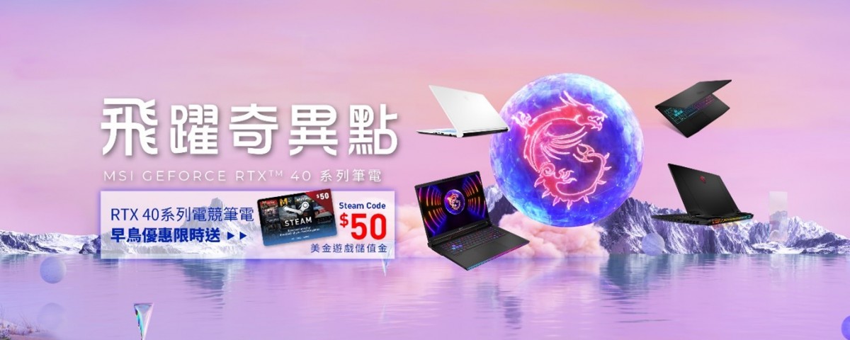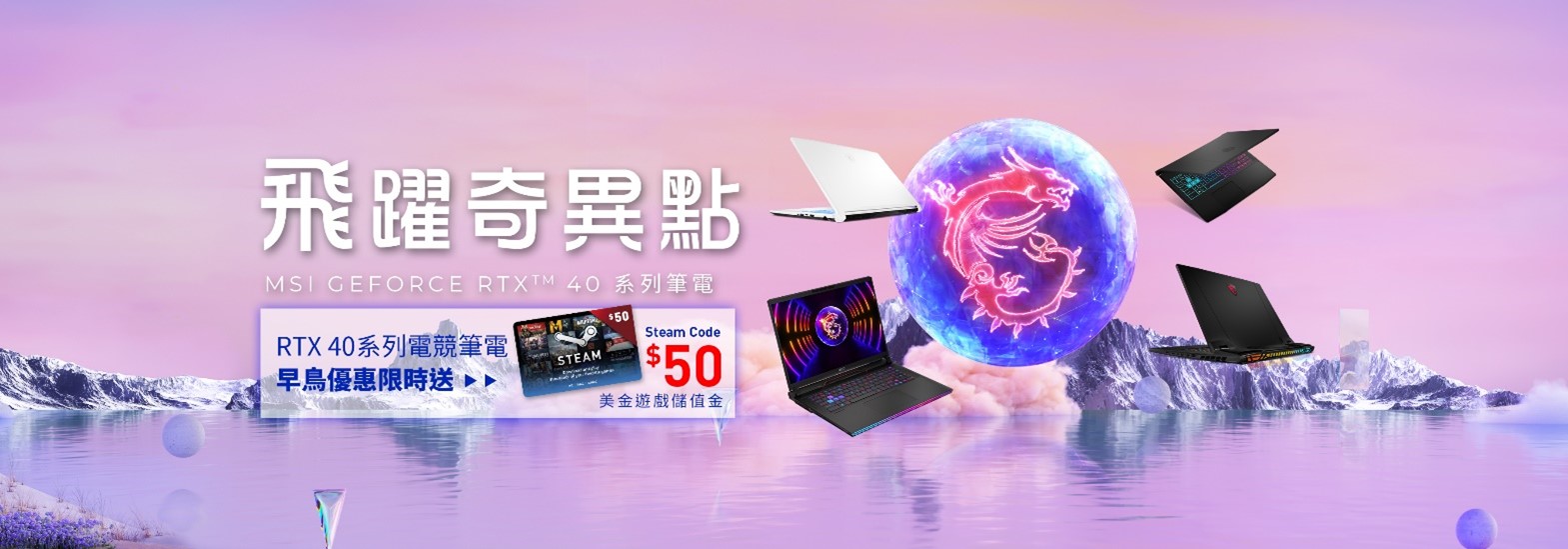 全球筆電領導品牌MSI於今日舉行MSIology-「飛躍奇異點」線上發表會,完整介紹搭載NVIDIA GeForce RTX 40系列筆記型電腦GPU、第13代Intel® Core™處理器的全新系列筆電。除了傳遞劃時代的產品技術與特色,MSI更是領先市場將最新產品直接帶到消費者面前!電競筆電部分,玩家引頸期盼的旗艦夢幻逸品Titan GT77 HX、Raider GE78 HX最高搭載GeForce RTX™ 4090 / GeForce RTX™ 4080筆記型電腦GPU,即日起開放預購;熱血電競Katana / Sword / Cyborg系列搭載GeForce RTX™ 4060 / GeForce RTX™ 4050筆記型電腦GPU,預計於二月中旬開放預購。即日起至2023/3/31早鳥活動期間選購搭載GeForce RTX 40系列筆記型電腦GPU 的MSI電競筆電,即可獲得Steam錢包儲值碼$50美金,2023/2/28前再加碼送最高電子現金即享券6,000元,數量有限,送完為止;商務筆電部分,全新13吋的羽量纖薄Prestige 13 Evo、翻轉觸控Summit E13 Flip Evo等兩款商務筆電即日起正式開賣。
