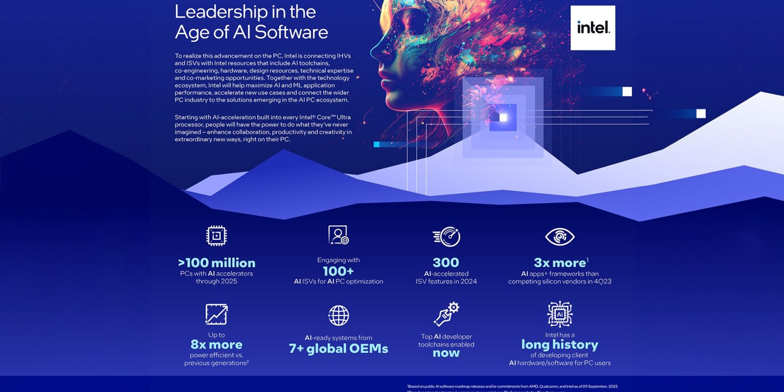 - 透過AI PC加速計劃與即將於12月發佈的Intel® Core™ Ultra處理器,將推動於2025年前在超過1億台個人電腦上實現AI應用。