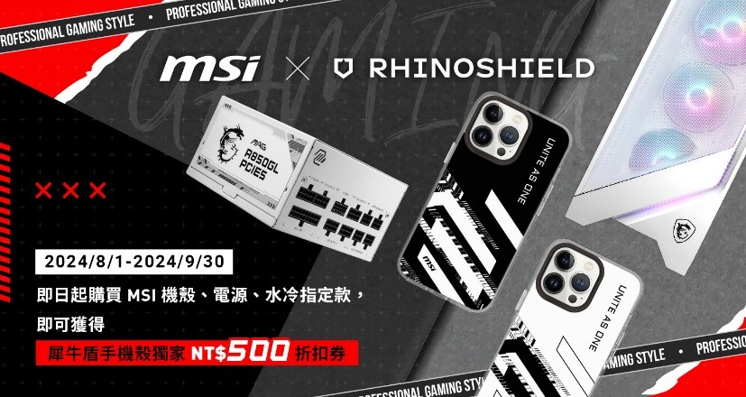 為慶祝MSI成立38週年,MSI特與 RHINOSHIELD 犀牛盾合作,推出『夏日嬉水』、『阿 Q 龍』、『MEG』等七款限量手機殼,可搭配犀牛盾Clear抗黃化透明防摔系列、JellyTint半透明有色防摔系列或Solidsuit經典防摔系列等自行搭配選購。自2024/8/1起自2024/9/30止,購買MSI機殼、電源或一體式水冷指定款,即可獲得MSI X Rhinoshield NT 500現金抵用券,可直接折抵MSI X Rhinoshield 龍粉限量版手機殼。更多資訊可至MSI活動網頁查詢https://tw.msi.com/Promotion/MSIxRhinoshield。