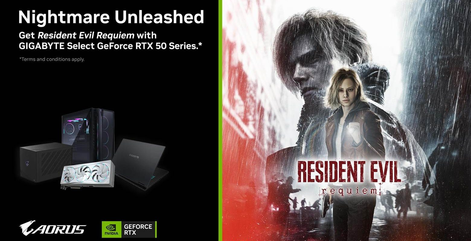 全球電腦領導品牌技嘉科技攜手 NVIDIA 推出《Resident Evil™ Requiem》遊戲套裝合作,涵蓋搭載GeForce RTX™ 5070 以上桌上型或筆記型電腦專用的顯示卡、AI 電競筆電與電競主機。GeForce RTX™ 50 系列顯示卡採用 NVIDIA Blackwell 架構,透過路徑追蹤、DLSS 4 與 Reflex 等技術為玩家帶來突破性的遊戲體驗。RTX™ 50 系列顯示卡具備強大的 AI 運算能力,可為不同遊戲情境提供高擬真度的圖像;結合技嘉在各產品線導入的獨家散熱設計,讓玩家在《Resident Evil™ Requiem》中享有前所未有的流暢度與絕佳沉浸的視覺效果。